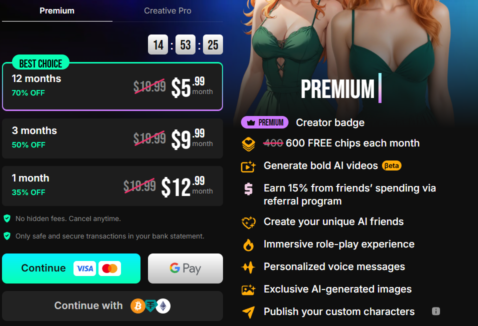 I’d argue that among the platforms I reviewed, Lovix.ai offers the best mix of quality features at the most affordable price. The subscription is offered at a fraction of the price, yet the range of features you get is truly impressive: NSFW AI photo and video generation, voice chats, full freedom of your character customization, great quality of responses that are based on your chat history, selected character traits, your relationship status, and many more. I’d say it’s the best price-quality balance I encountered while doing my research.