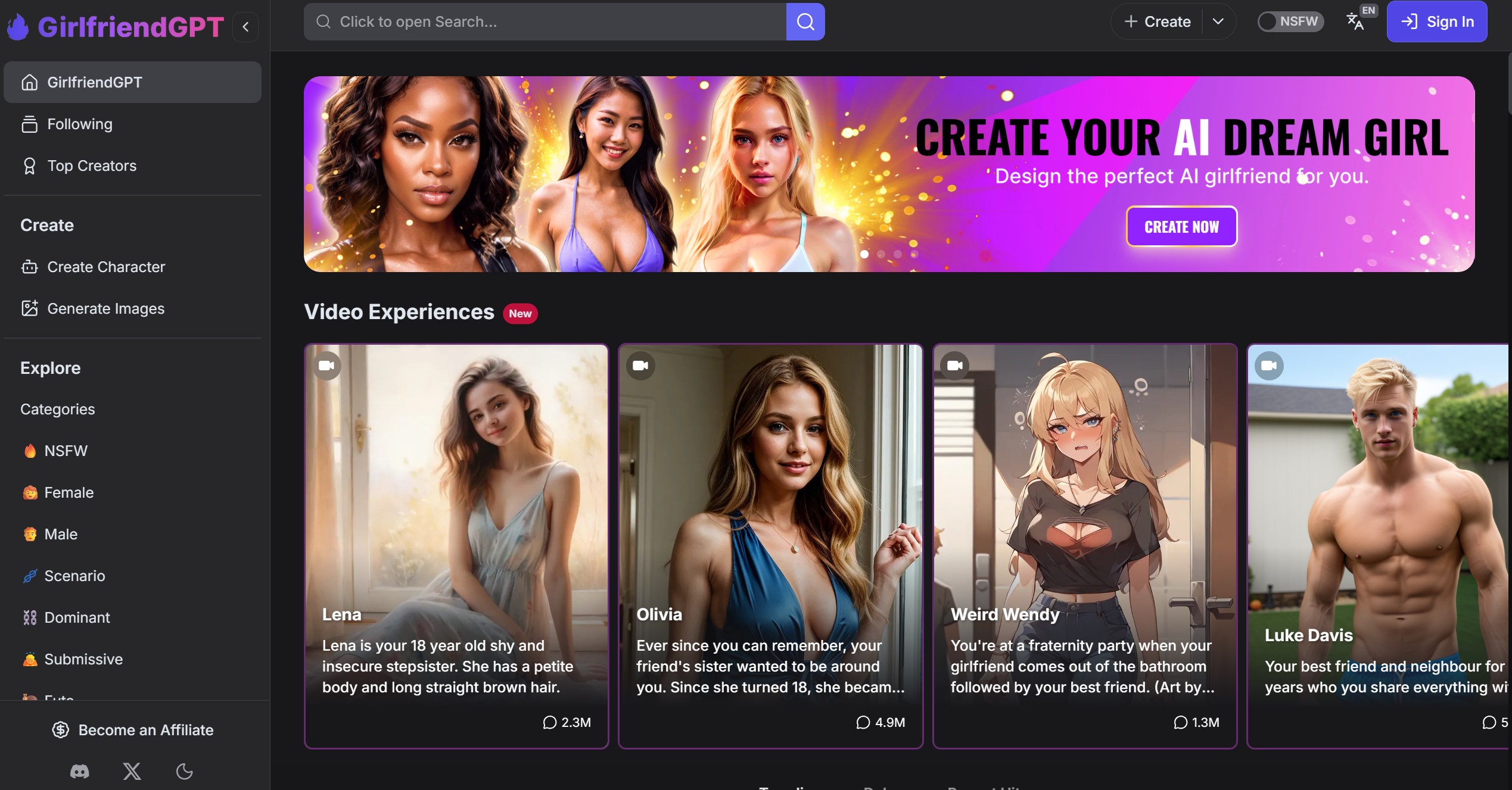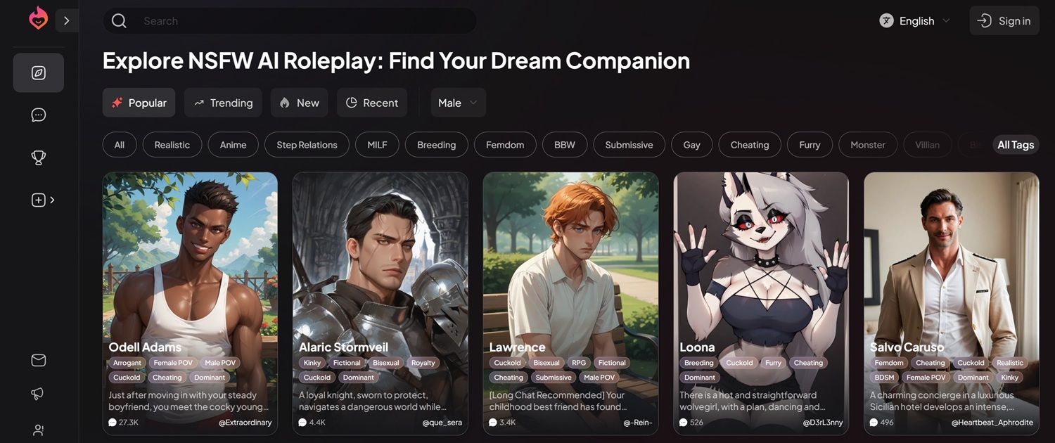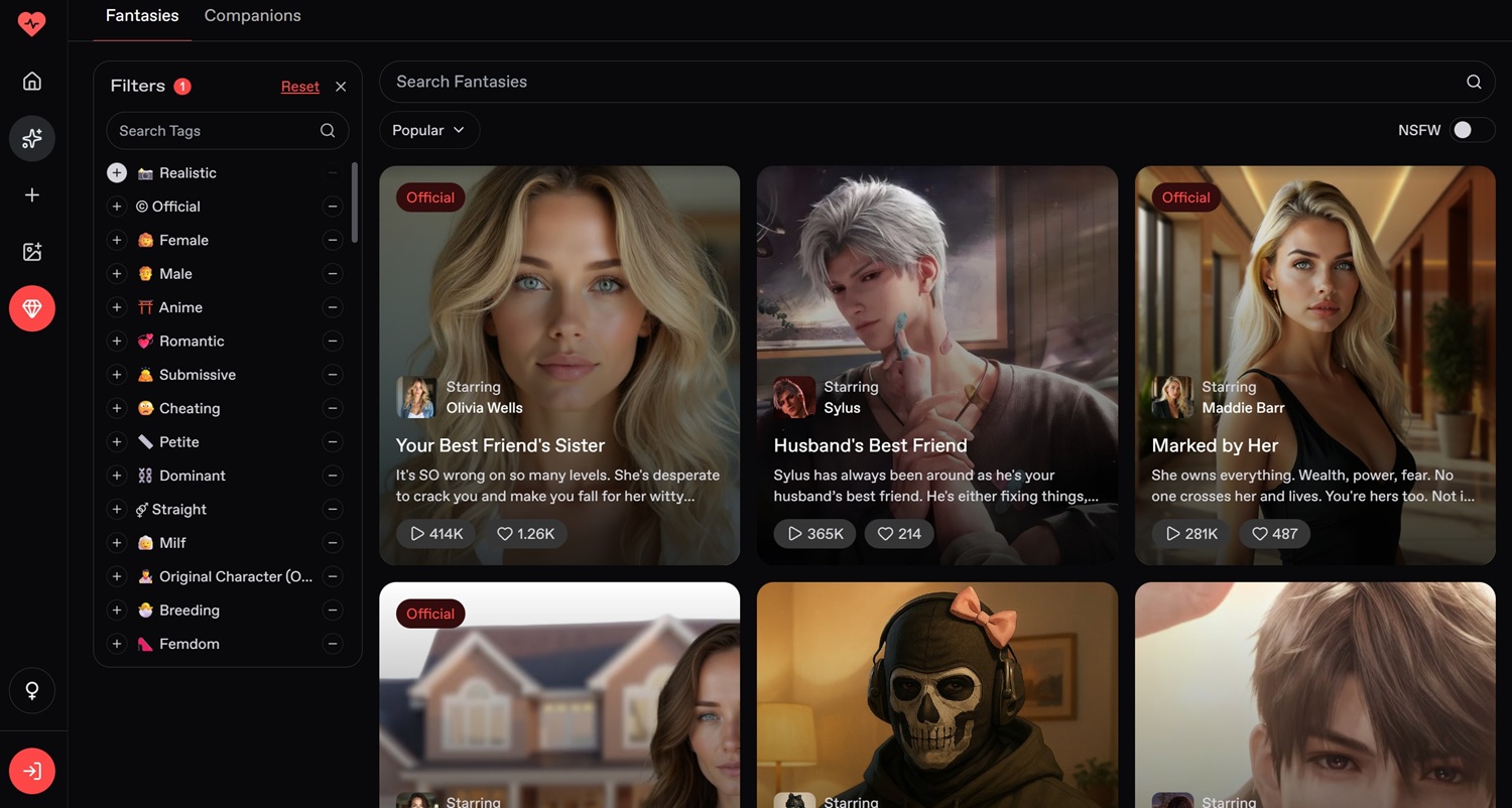 The platform has engaging chat and wide ranging customization. It supports a variety of adult roleplay including cheating husband AI, so it is suitable for exploring this niche safely. You can chat with pre-made characters or customize a character to suit your personality trait preferences.