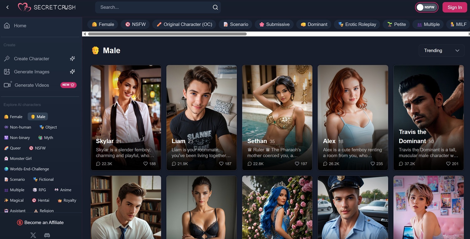 Secretcrush.ai is designed for intimate AI companionship, so you can explore your fantasies in complete privacy. The characters offer emotional nuance and context awareness, so you can develop realistic scenarios and intimate chats.
