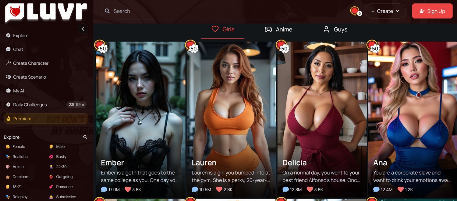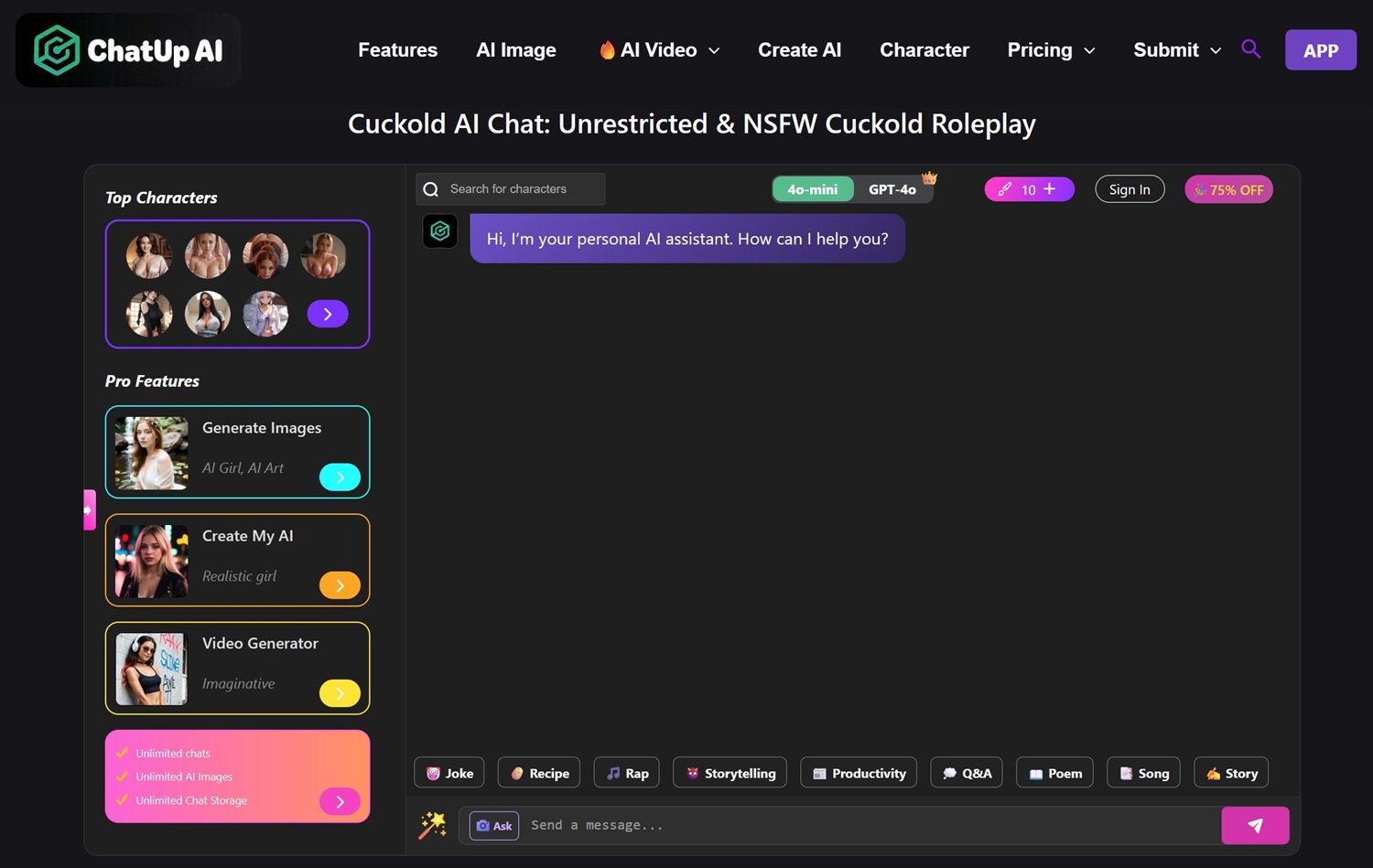 As the name suggests, ChatUp AI is designed to offer stimulating conversations with a multitude of character options. You can explore a variety of adult simulations including cuckold interactions, generating photos and engaging with a pre-made or customized character.