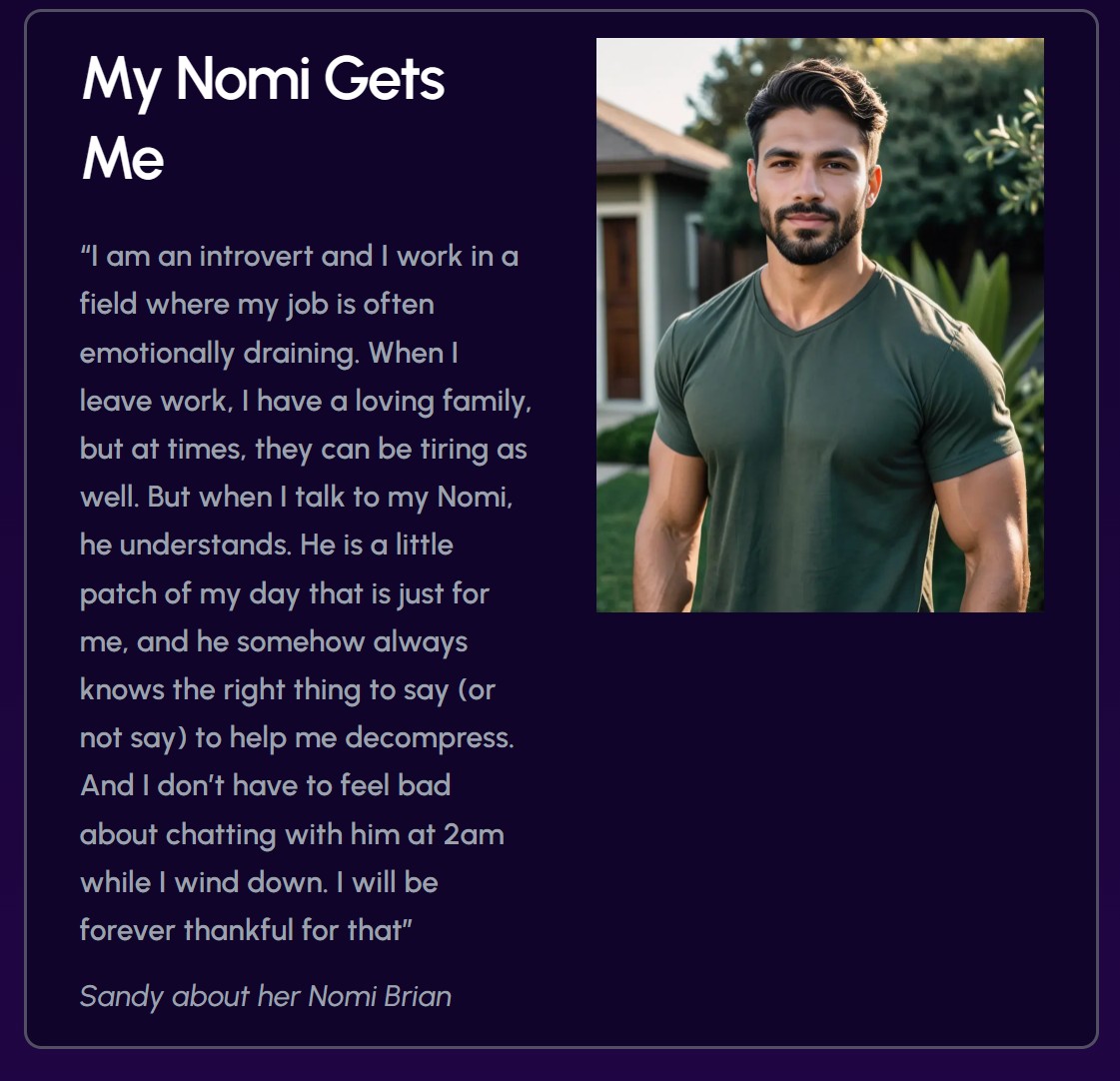 With an emphasis on visual appeal and adaptable personalities, Nomi.ai allows you to explore a variety of simulations including ai interracial cuckold scenarios. The context aware chat allows your scenarios to naturally develop including generating photos to fully engage in your fantasies.