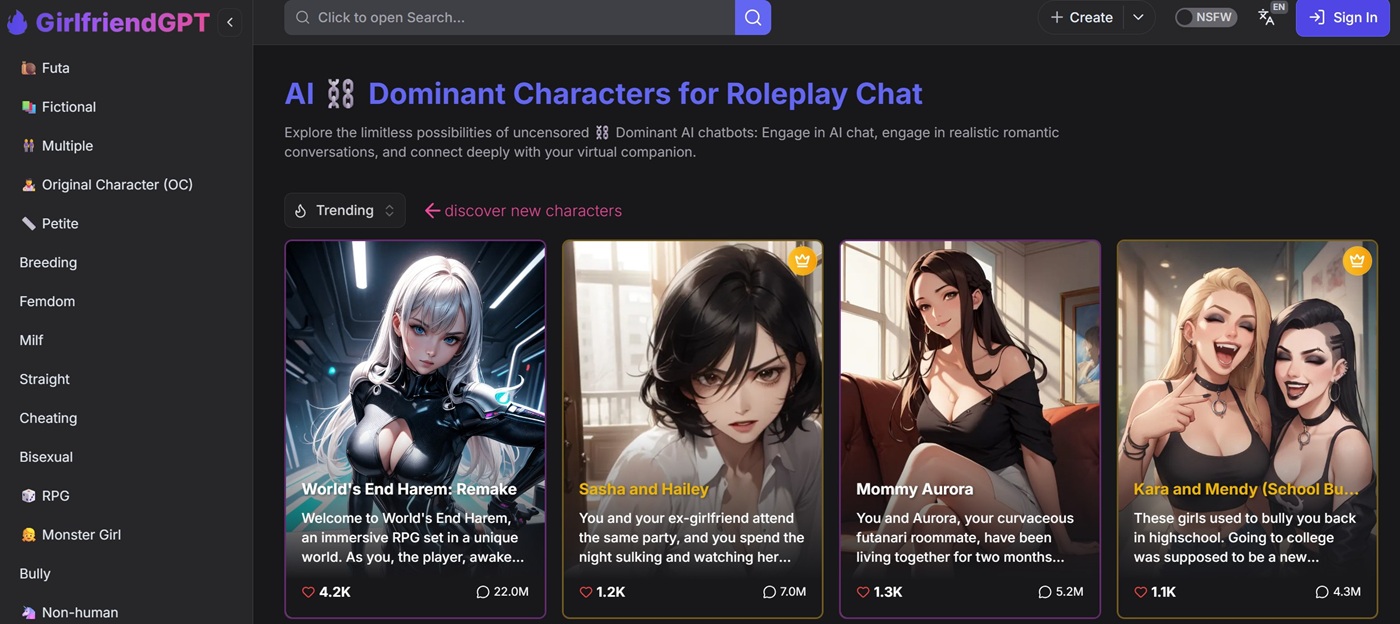 To evaluate femdom-focused AI apps and websites, I decided to explore a new side of adult content: AI chats. Here is what I was looking at to get a good idea of the female domination available online.