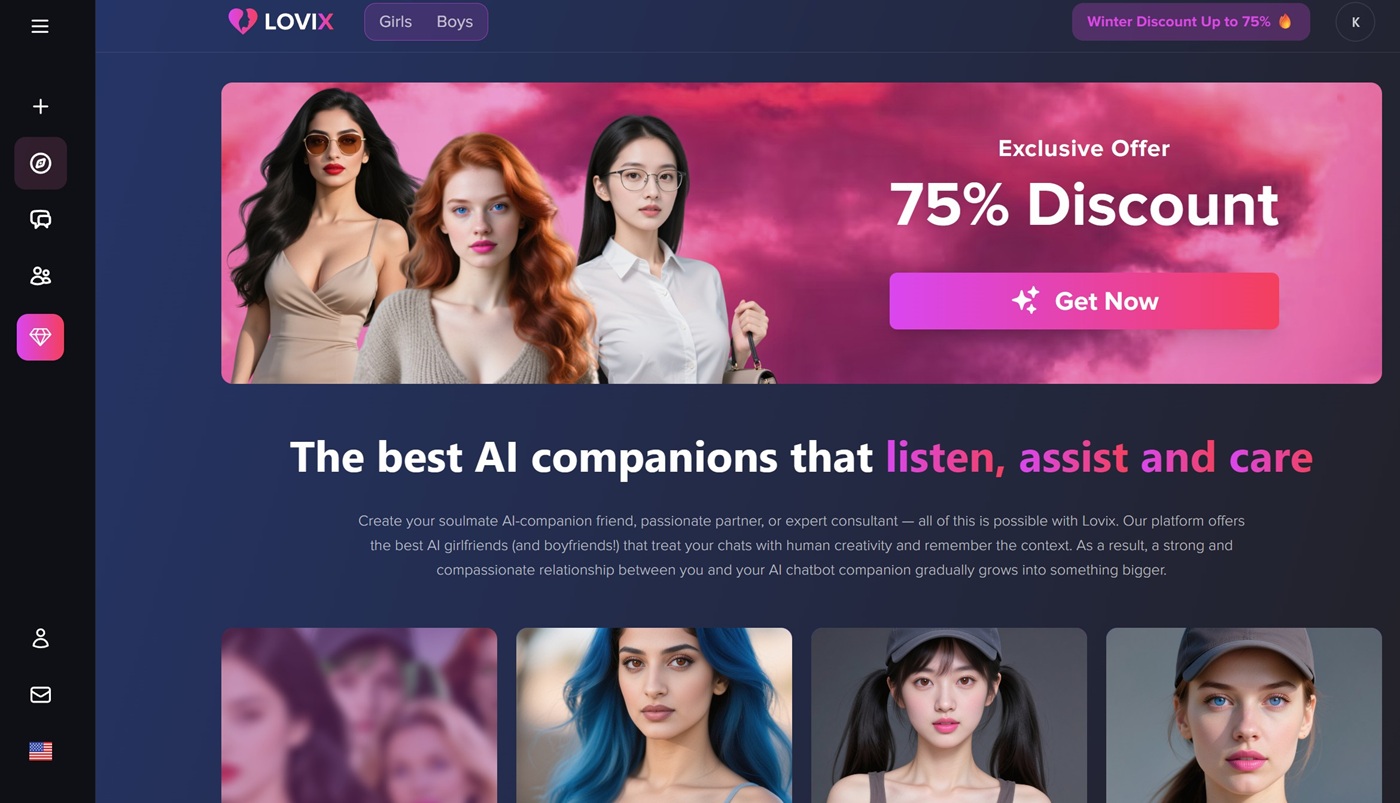 Lovix.ai is a fast growing platform that is designed for the user who wants a highly personalized and engaging digital relationship. Combining advanced character creation with realistic conversation, you can enjoy image generation, visual customization and authentic interactions.